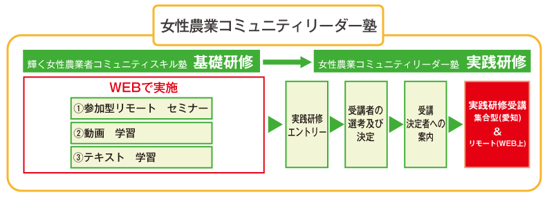 - ★”女性農業コミュニティリーダー塾”は『基礎研修(導入編) 』と『実践研修(学びを深める場)』で構成されています。