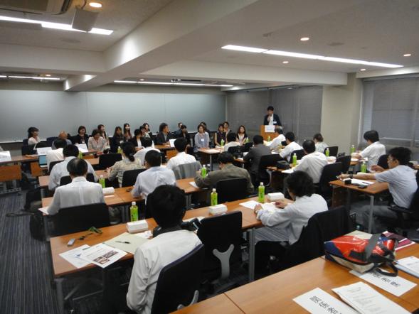 マイクを握る男性の後ろで神妙な顔つきをされている育成塾参加者のみなさん。
