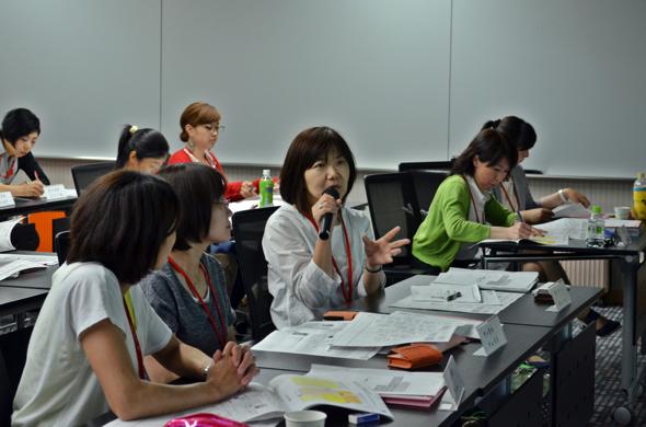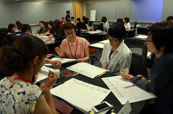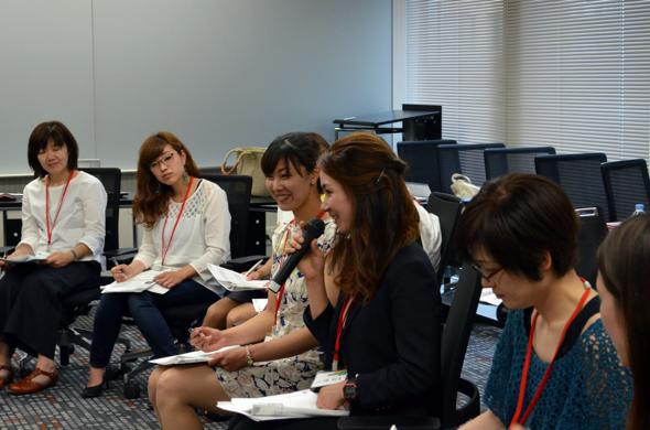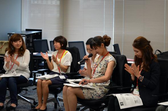 高橋先生から「自分を何かに例えて自己紹介しましょう」という“お題”が出され…「マグロ」「温泉」「一人吉本新喜劇」「永遠の副リーダー」といったキャッチフレーズが次々と飛び出しました。知らず知らずのうちに、アピールしたいモノ(この場合は自分自身)を、ひとことで表現する技術を学んでいるようです。