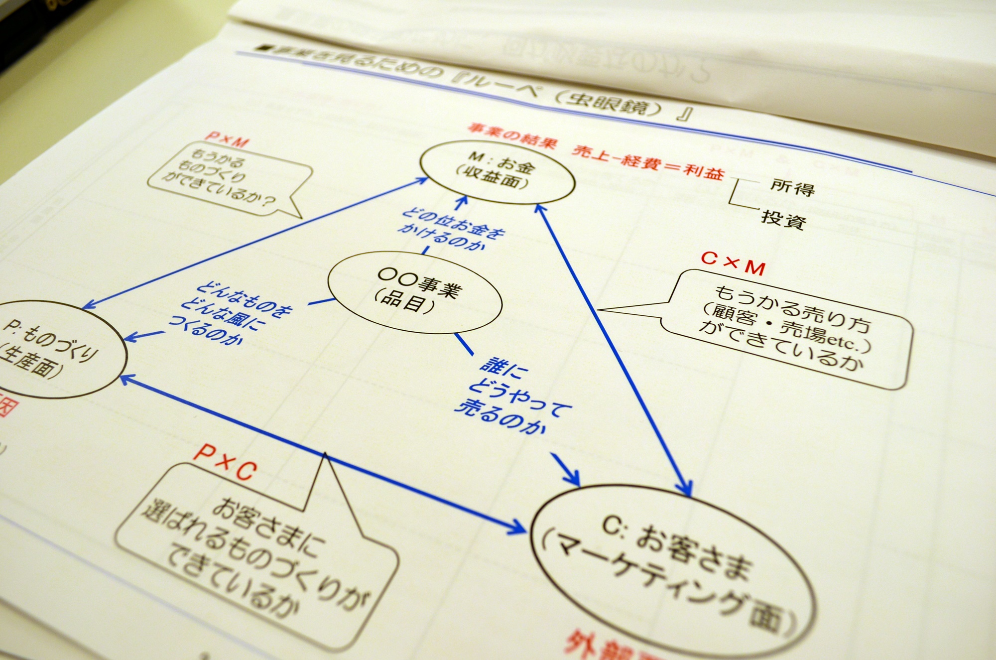 魔法のルーペとは、事業を見る視点のこと。「M(お金)」「P(ものづくり)」「C(お客さま)」の3つの視点について、前半戦でしっかり学んだ「C」以外の要素とは・・・? 以下( ↓ )の章でまとめてお伝えします。