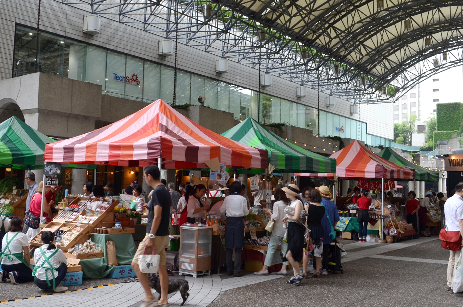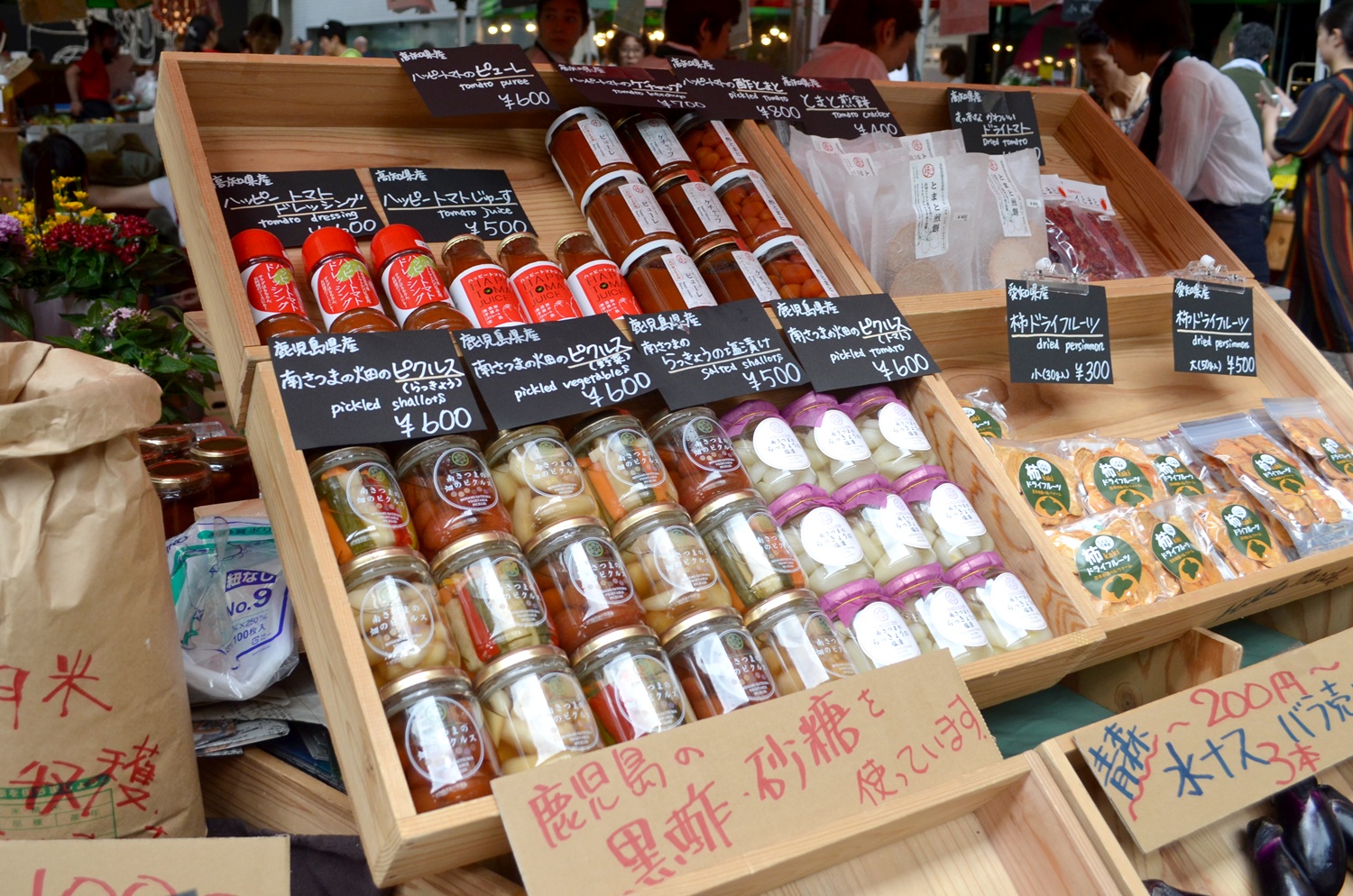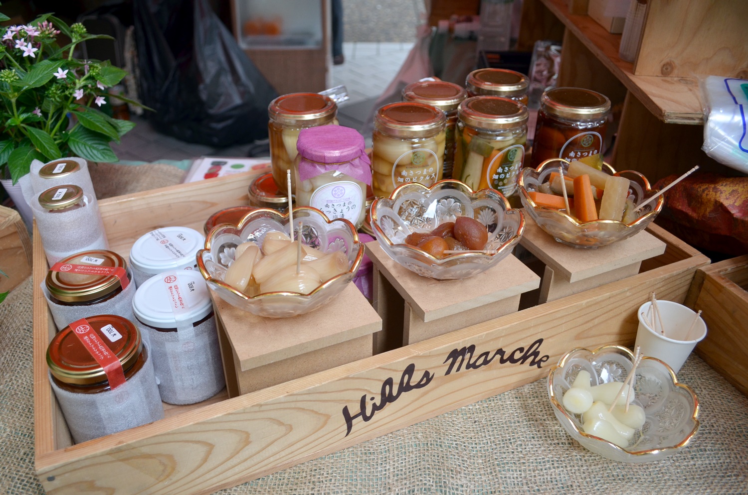 涼やかな器を使い、ちょっと気になる試食ブースも用意。この横に並べられた花の鉢植えが華を添え、 マルシェらしい雰囲気のコーナーになっていました。