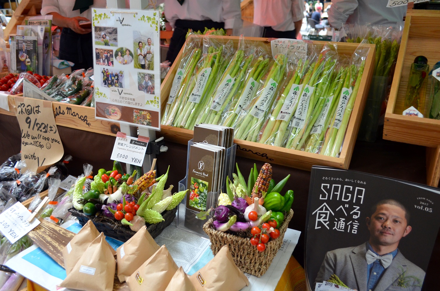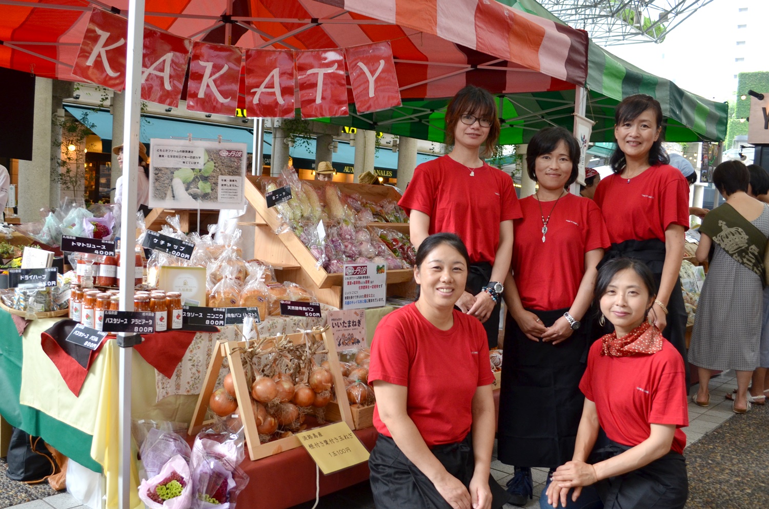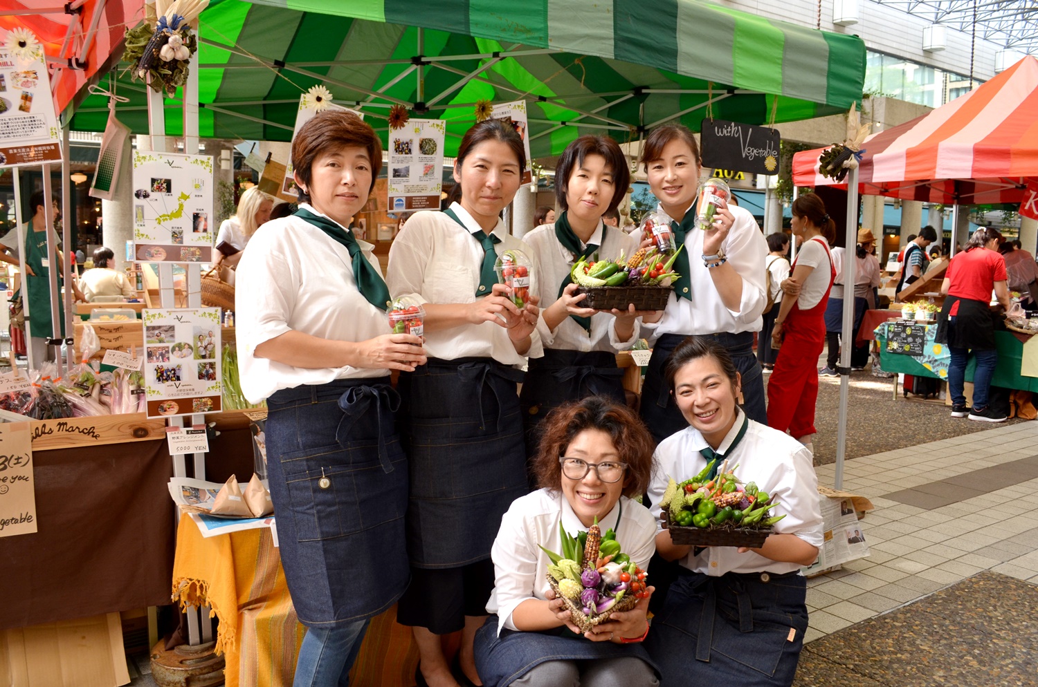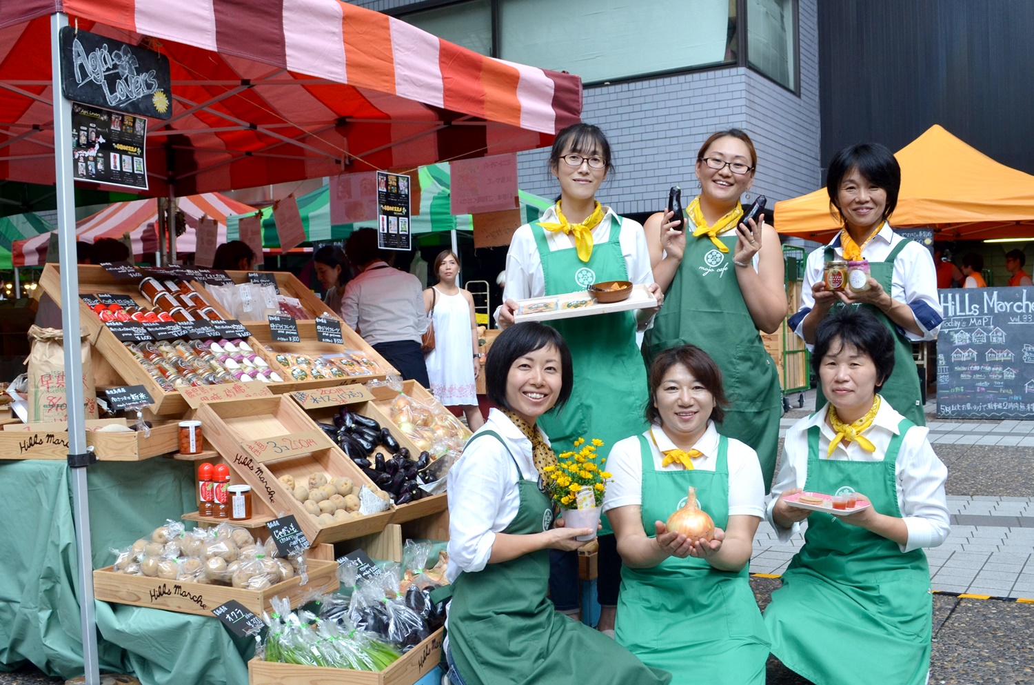 グリーンのエプロンとイエローのスカーフで統一! 売り場の上には加工品の瓶やパッケージをズラリと並べ、 その下には水ナス、じゃがいも、玉ねぎなどを陳列しています。