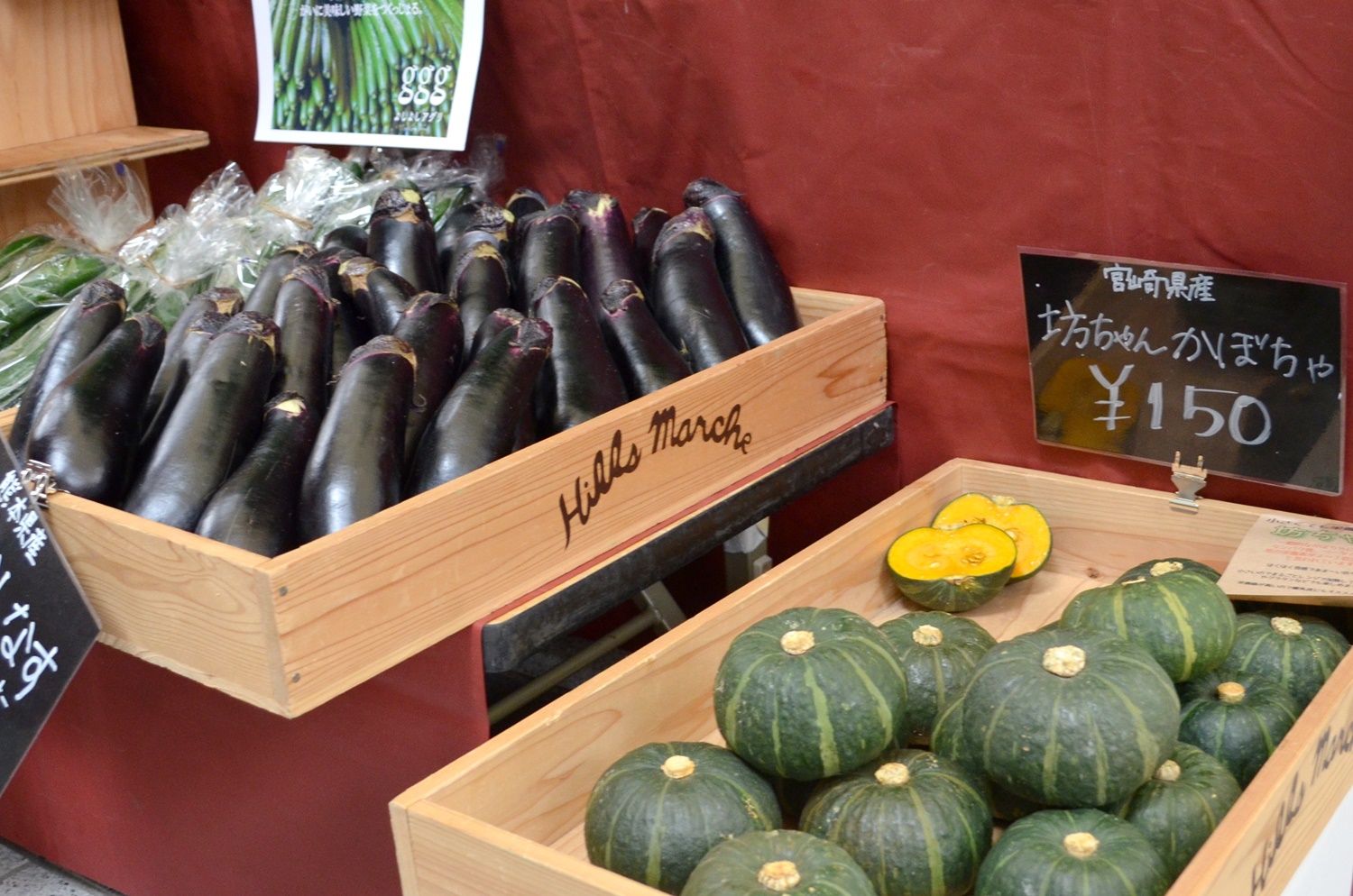 手のひらサイズの“坊っちゃんかぼちゃ”や、ナスを箱に直接積んでマルシェ感のあるレイアウトです。