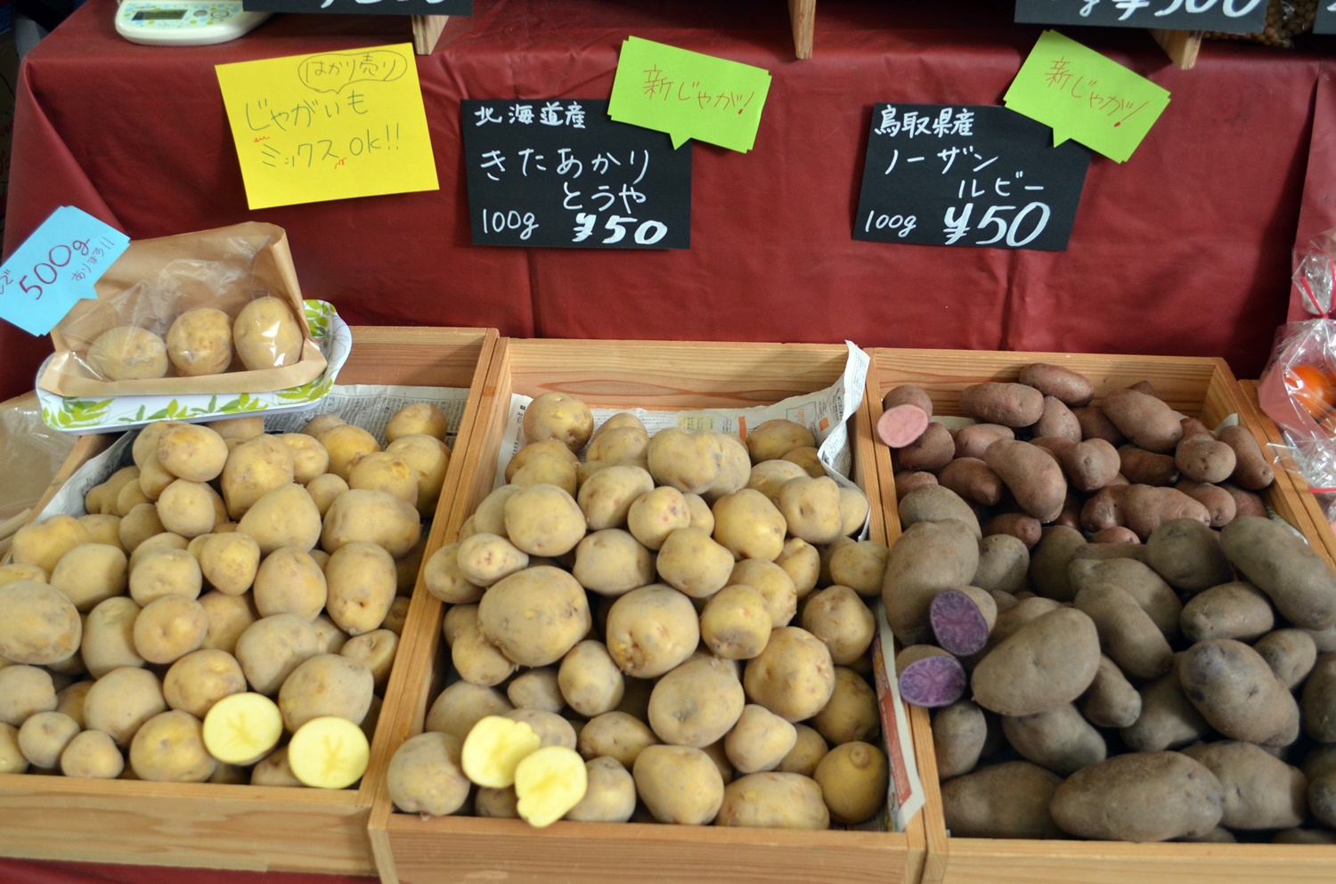 じゃがいもを山盛りにして量り売りにするなど、こちらもマルシェらしい店作り。記者もつい買ってしまいました。