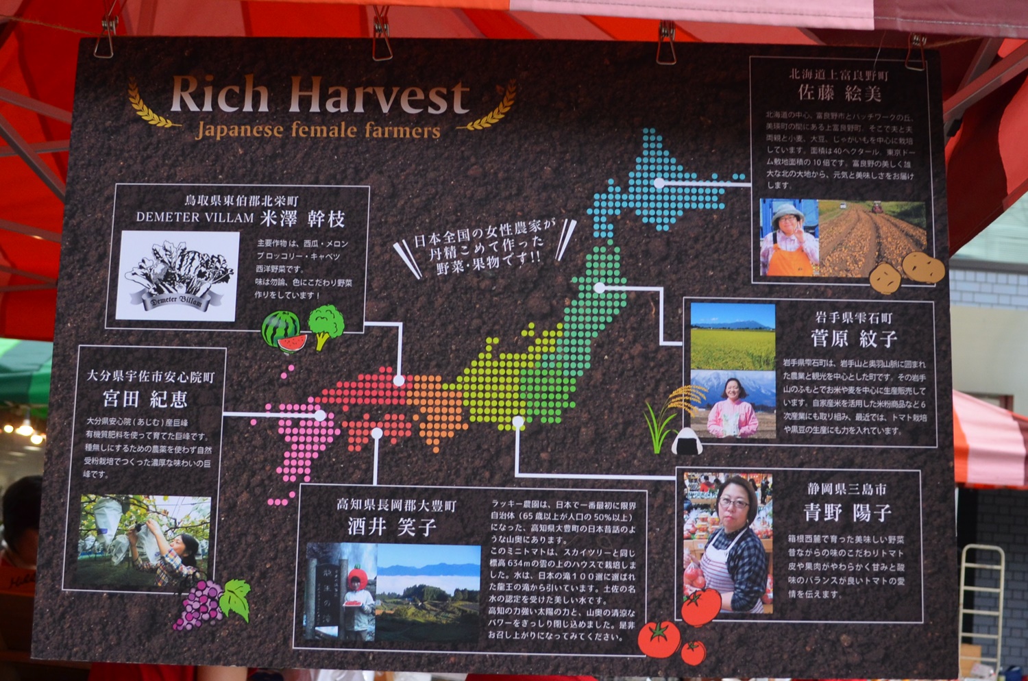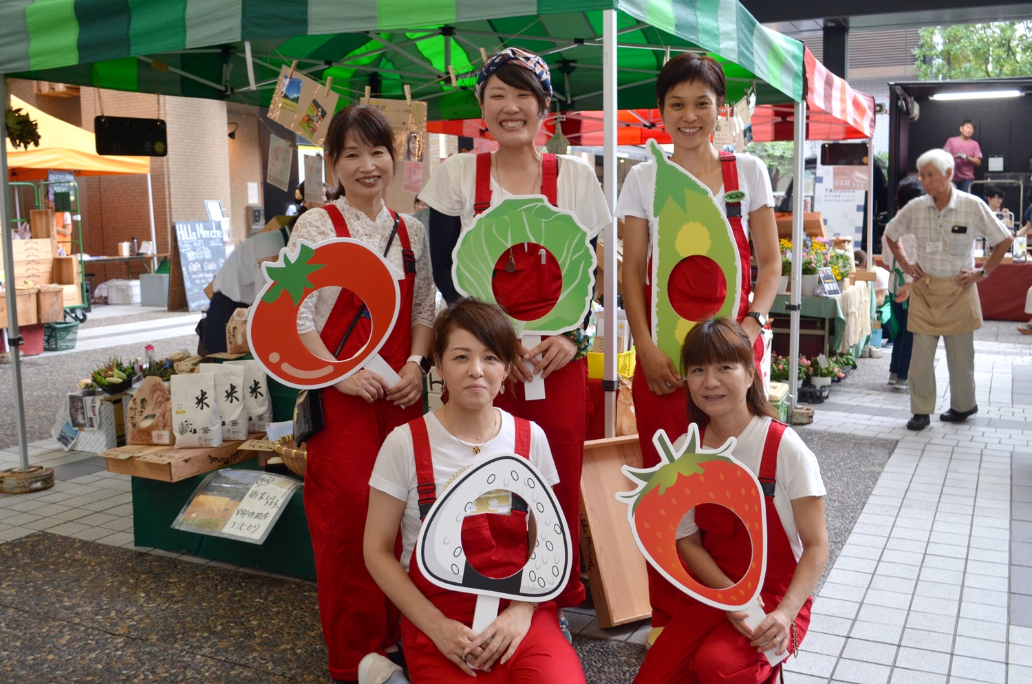 赤いオーバーオールでキュートに揃えた「Happy Sun Farm」。木製の看板は、丸野さんの手描きです。さらには丸野さん手作りの顔出しパネルを用意!(ただ、思っていたほど小さなお子さんは来なかったそう…。)