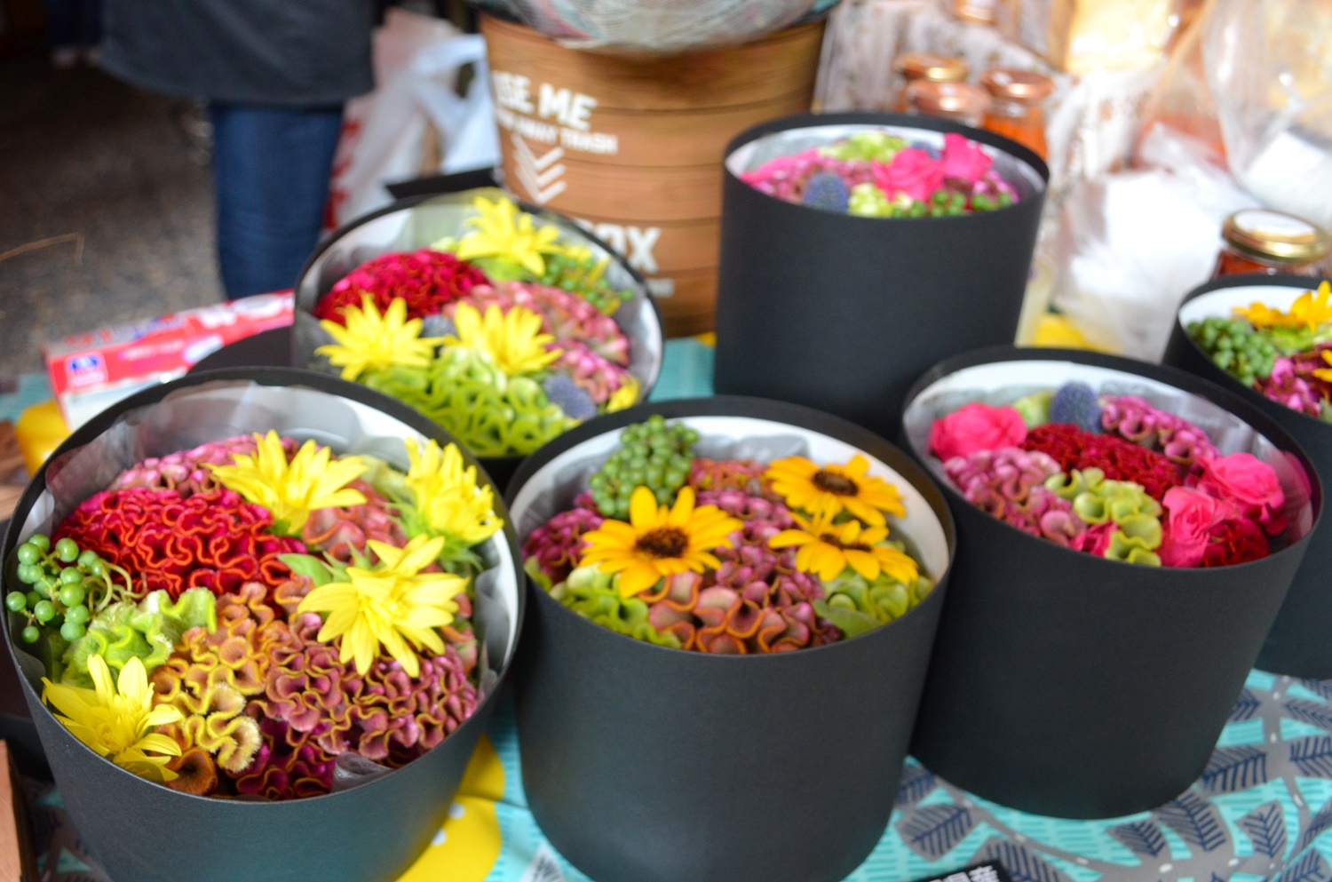 向井さんのケイトウのアレンジも並べてスタイリッシュです。こんなに珍しい色もあるんですね! みなさん赤いTシャツで揃え、明るい売り場です。