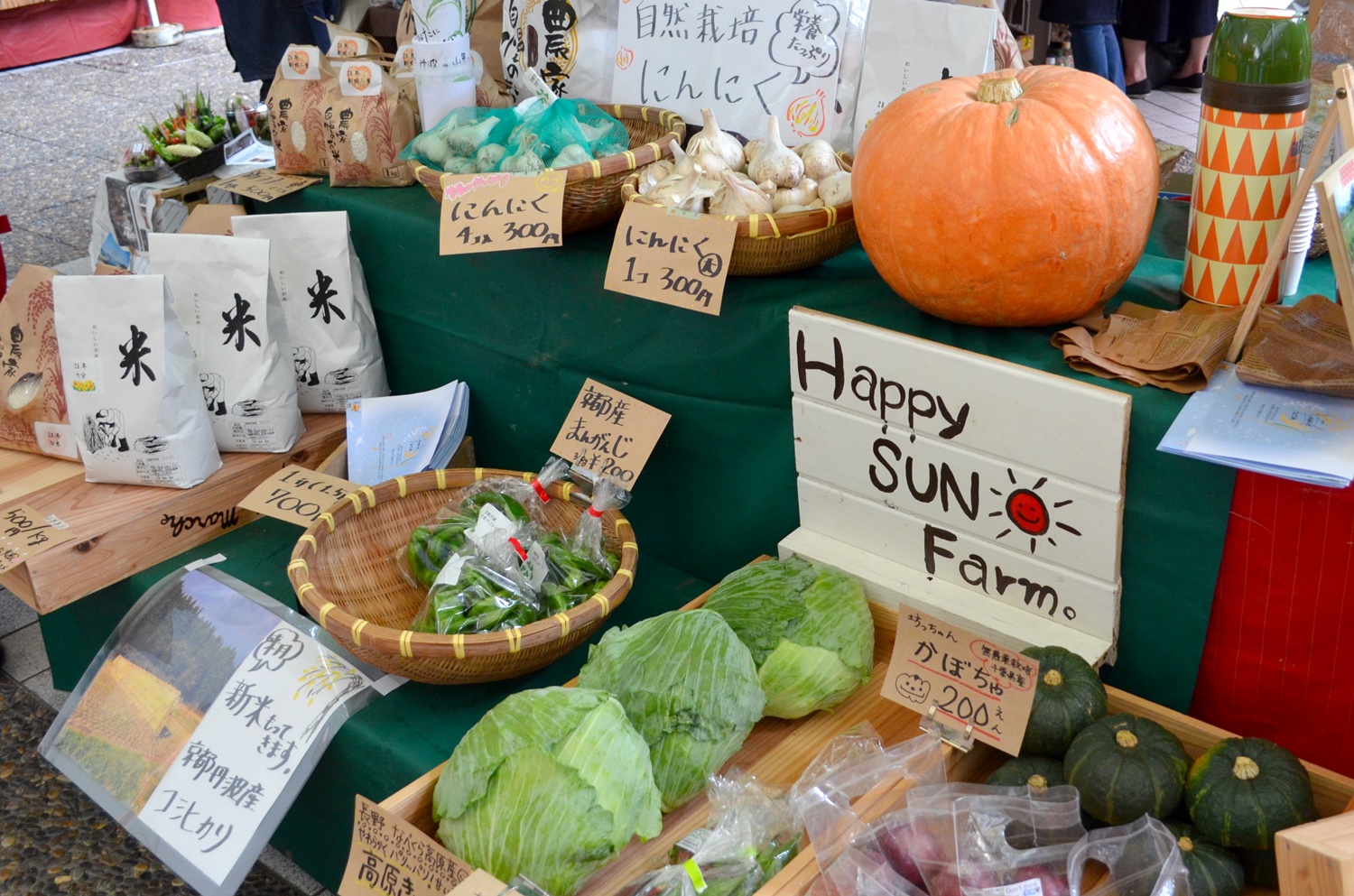 整然と商品を並べ、スッキリした見た目。リンゴやお米の試食が人気を呼んでいました。お客さんに試食してもらっている間に、いろいろな話が聞けたとのこと。
