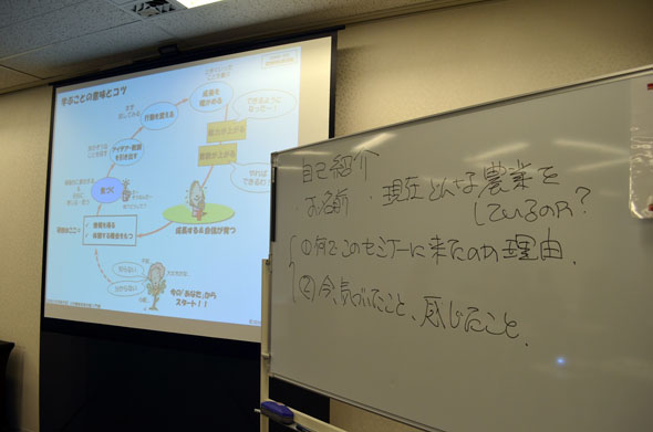講義のあとは、グループに分かれて自己紹介。そして自農園・自社の事業モデル作成実習です。