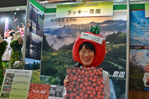 また、FOODEX出展に際しては、バイヤーさんがどういう反応をするのかも知りたかったそう。いつもやっているという“かぶりもの”も身につけ、呼び込んでいました。北海道からIターンし、夫婦で就農して6年という酒井さん。農園をもっと大きくしていくために、学びは続きます!