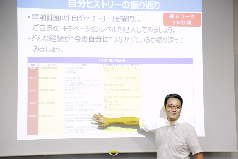 リーダー塾は、講義を聞いているだけではありません。早速、岡先生から「自分の歴史」を振り返り、それをグループ内で共有するというワークが出されました。相手の反応などを見ながら、「自分の価値観」や「価値観の多様性」を再確認できるワークです。