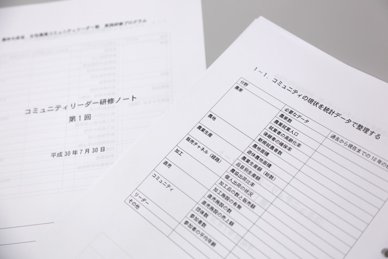 農業就業人口、加工品の販売額、コミュニティの平均年齢などを調べ、研修ノートにデータを書き込んでいくことで、現状が可視化できるようになっています。