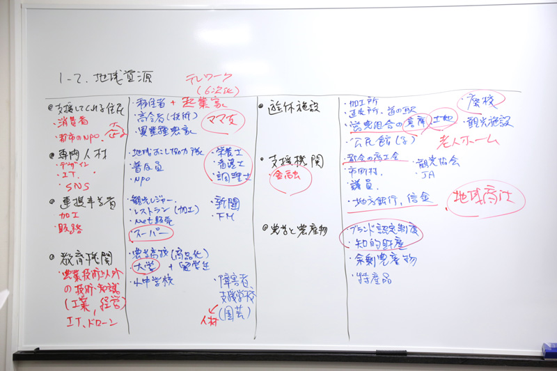 書き出した地域資源を各グループで発表して、板書していきます。栄養士さんや移住者などの人材、大学などの教育機関、観光施設など、仲間に巻き込めそうな相手がたくさんあがりました。