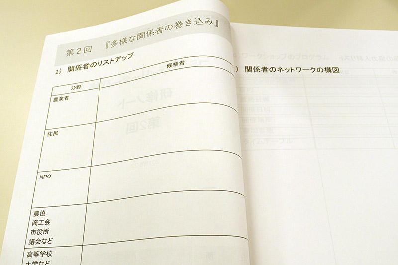 そのあとは、さらに深めていくグループワーク。追加すべき地域のキーパーソンや、外部の専門家を書き足していきます。キーパーソンを押さえれば、関係をより強固にすることができ、不足情報やノウハウは、外部の力を活用することも有効。金融機関や大学、国のコーディネーターなど、グループ内で発表し合えば、1人では思いつかなかったアイデアもひらめきます!