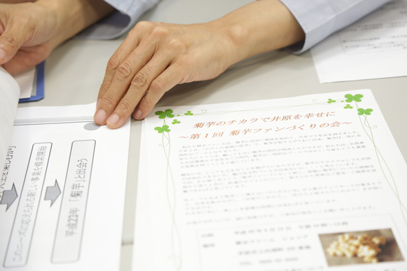 そして、健康によいとされるキク科のイモ「菊芋」を栽培する江尻さんは、地域おこし協力隊などを集め、菊芋の魅力をアピール! ビジョン実現のイメージがわくように、写真などのビジュアルを多用したそうです。魅力的なチラシは人を動かしますね。