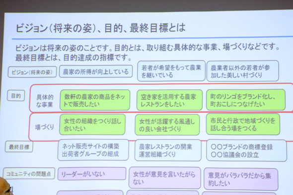 「たとえば、『農産物をブランド化したい』というビジョンがあった場合、最終的な目標としては『商標登録を取る』『協議会をつくる』『加工品を5種類つくる』などが想定できますよね」