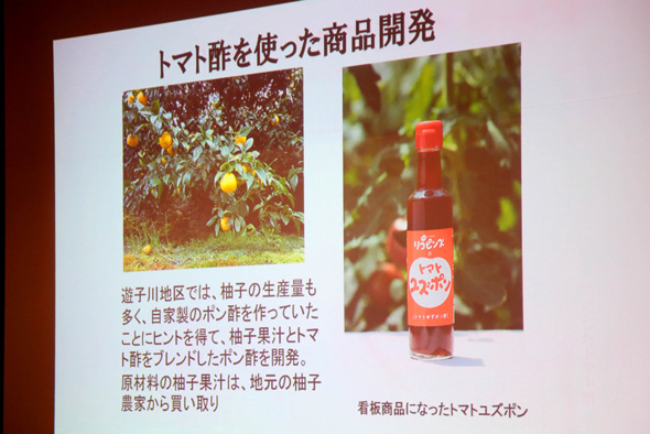 じゃあどうすれば? と、試行錯誤の末に思いついたのが「トマトのポン酢」! 遊子川地区ではユズの生産も多く、ポン酢として加工していたことにヒントを得たそうです。その酢づくりのノウハウも、立派な地域資源ですね。