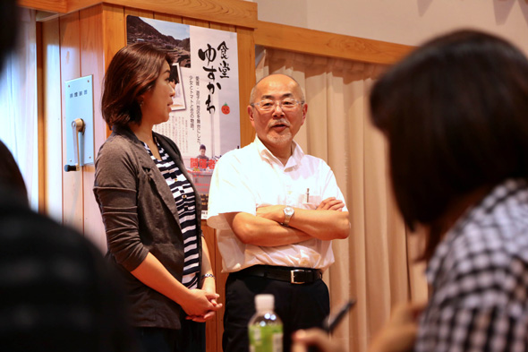 食堂ゆすかわで、トマトの加工品を購入。すいぶんたくさんお買いになりましたねぇ~。「これで地域ブランドの研究もするつもりですが……、実は地元で待っている仲間に『モチベーションのおすそわけ』として配りたいんです!」。常に仲間のことを考え、リーダーとしての心がけを忘れない皆さんでした。