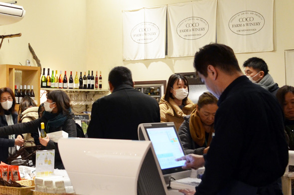 塾生たちも越知さんの話を聞いてすっかり協力者に!「こころみ学園」の関連商品が買えるショップでのお土産選びにも熱が入ります。ココ・ファーム・ワイナリーのストーリーに惹かれたファンが全国にはたくさんいて、ワインの約80%が通信販売で売れているのです。