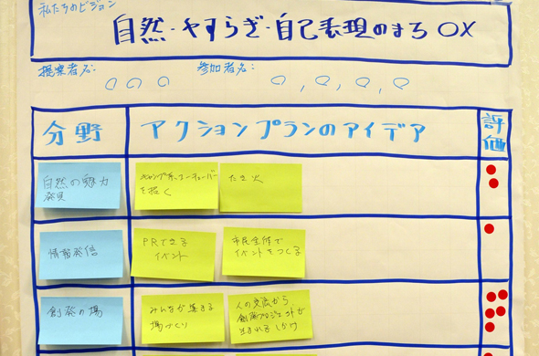 記録係は模造紙①に「私たちのビジョン」「提案者名」「参加者名」を書き、掲示します。そして「分野」欄に、得票数の多かった分野を、青いカードに書いて貼っていきます。