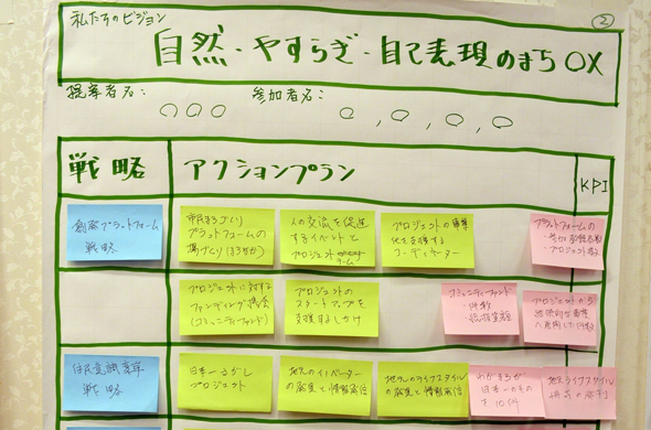 これまでの意見をさらに具体的にする試みです。記録係は模造紙②に「ビジョン」を書き、「戦略」「アクションプラン」「KPI」の欄を作って掲示。 模造紙①の「分野」で重要度の高かったものから「◯◯戦略」と名前を付けて青いカードに書き、模造紙②の「戦略」の欄に貼ります。 たとえば「住民意識の変革戦略」など、具体的に明記します。そして、同じく模造紙①の「アクションプランアイデア」も模造紙②に貼り替えます。