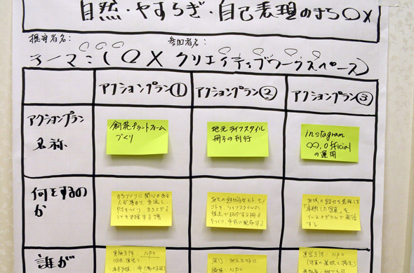 たとえば、「街中に◯◯の場を借りる」「市役所の支援を得る」「地元の出版社と冊子を作る」「インスタグラムで発信する」 「1年後に◯人集めてNPOを作る」など、さらに具体的にしていく作業です。