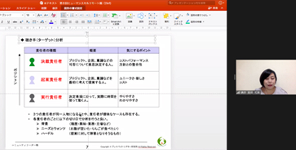 「まずは、聴き手(ターゲット)の分析が重要です。当日話を聴く人は、どのような立場で、どのような内容を求めているのかを予想します」と、画面に次の3者を示す高橋先生。