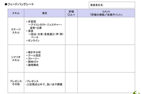 聴き手は、これまで習った「ステージ・スキル」「シナリオ・スキル」「プレゼンス」を評価できるフィードバックシートをもとに、提案者に改善のポイントを伝えていきます。 プレゼンが終わり、聴き手からは「『少子高齢化』という言葉だけではなく、実際で目で見たり体感したことが入っていて説得力があった」、 「あなたは本来元気な人だから、もっと元気に話してもいいんじゃない?」など、技術的な面だけではなく、塾生それぞれのキャラクターに踏み込んだアドバイスも交わされました。 これは、何度も顔を合わせている仲間同士だからこそ気づけることですね。