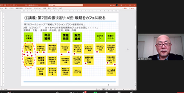 後半は、金子先生の講義。前回のワークショップで整理した「ビジョン実現のための戦略とアクション」を、いよいよ「実行可能な行動計画」として落とし込んでいきます。 今回も2つのグループに分かれてのワークショップです。